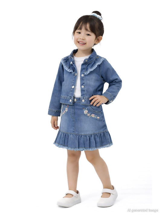 Civil girls nakışlı kot ceket etek 3 lü 2-5 yaş takım - mavi