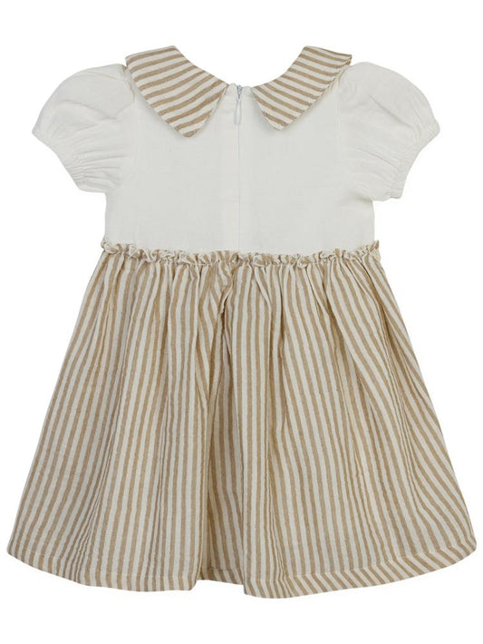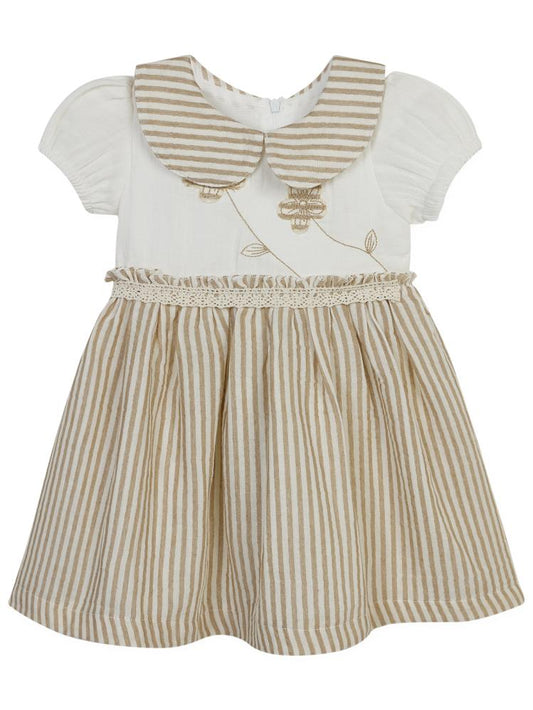Bombili çiçek nakışlı çizgili 1-3 yaş elbise - bej