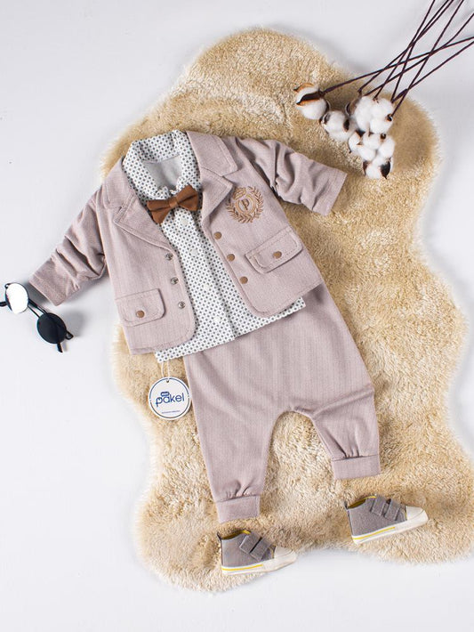 Mini pakel ceketli papyonlu 3'lü 1-6 ay takım - kahverengi