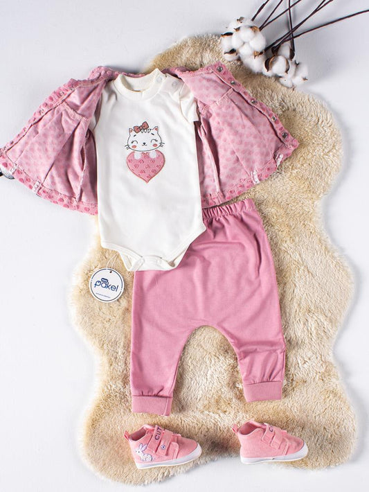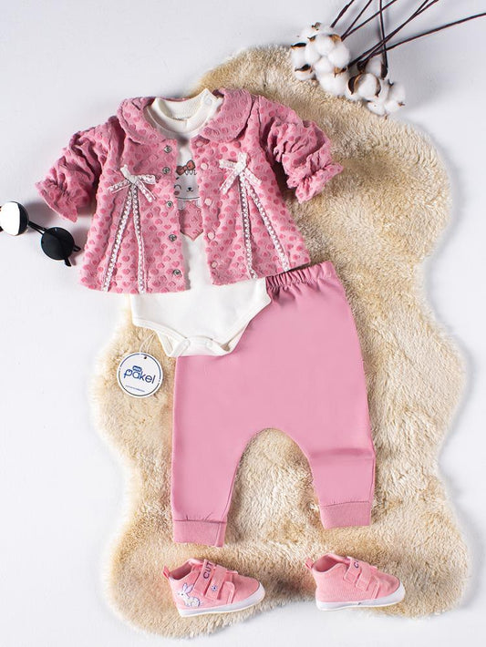 Mini pakel hırkalı kedi nakışlı 3'lü 1-6 ay takım - pembe