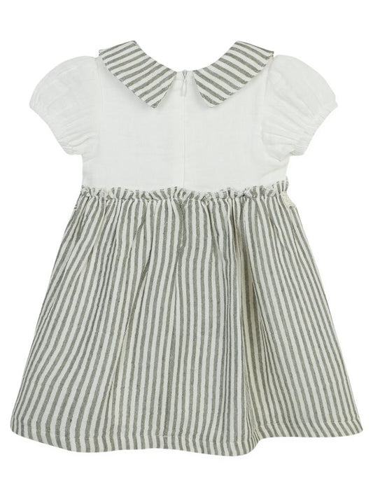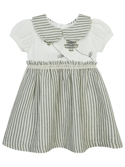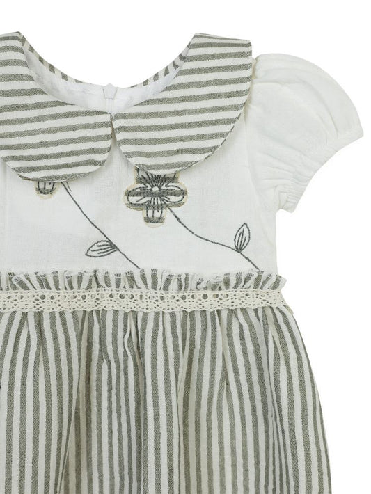 Bombili çiçek nakışlı çizgili 1-3 yaş elbise - haki
