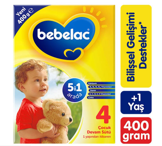 "Bebelac 4 Çocuk Devam Sütü 1 yaşından itibaren* 5i1 Arada • Kalsiyum• B1, B2, B5, B12 - A,C,D,E,K Vitaminleri• Demir...
