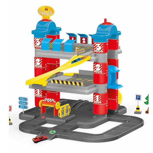 "3 katlı garaj oyun seti ile eğlenceli bir oyuna hazır olun! Graj setinde bulunan asansör, kaydırak, araba yıkama yeri, trafik levhaları...