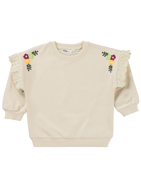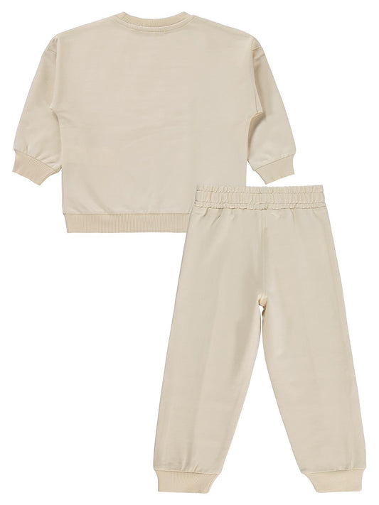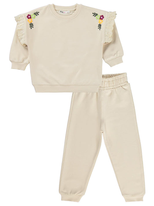 Civil girls kol fırfırlı sarmaşık nakışlı 2-5 yaş eşofman takımı - bej