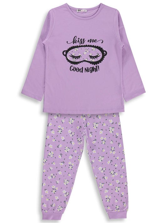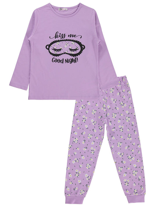 Civil girls çiçek desenli 6-9 yaş pijama takımı - lila
