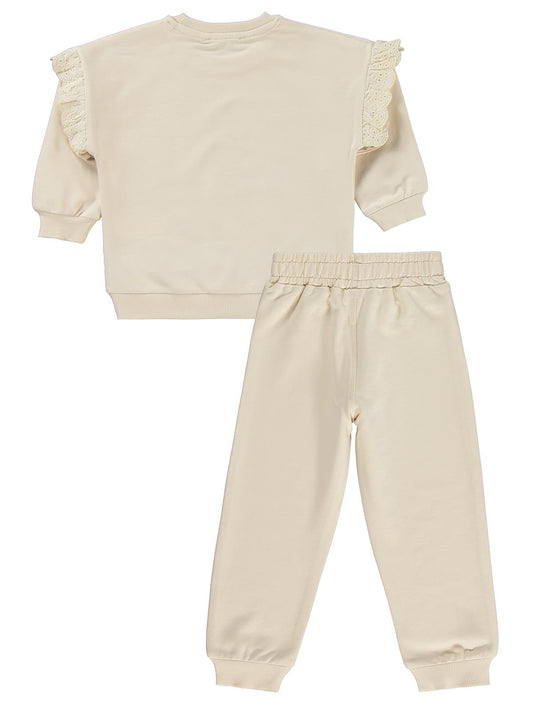 Civil girls kol fırfırlı sarmaşık nakışlı 2-5 yaş eşofman takımı - bej