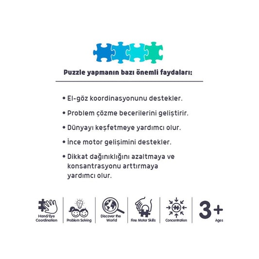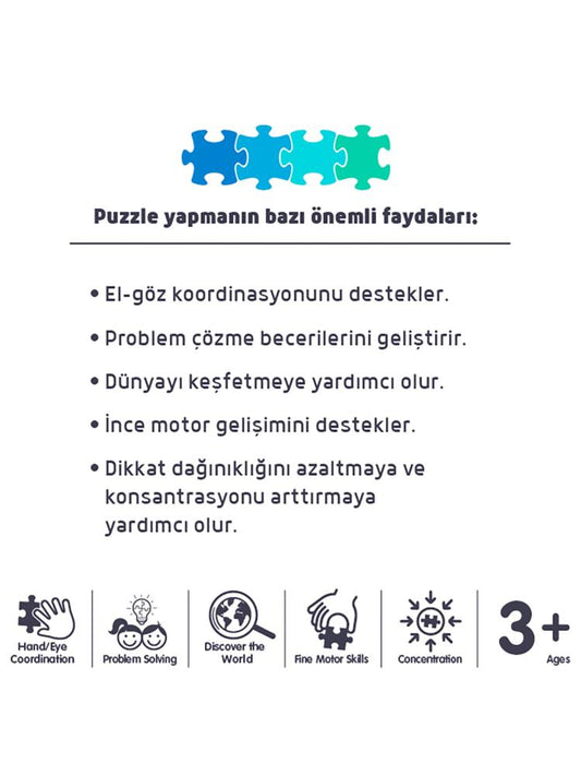 Puzzle yapmanın bazı önemli faydaları:Dikkat eksikliğini giderir.Görsel hafızayı geliştirir.Özgüven duygusu aşılar.Motor becerilerini geliştirir.Problem çözme yeteneğini geliştirir.