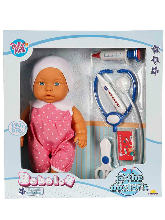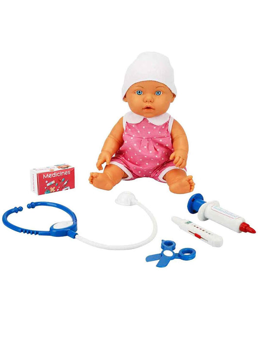 Oyuncak Bebek ağlar ve güler. Steteskop, termometre, makas, şırınga ve ilaç kutusu sete dahildir. Oyuncak bebek 30 cm boyundadır.