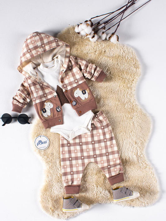 Mini pakel kapüşonlu yıldız nakışlı 3'lü 1-6 ay takım - kahverengi