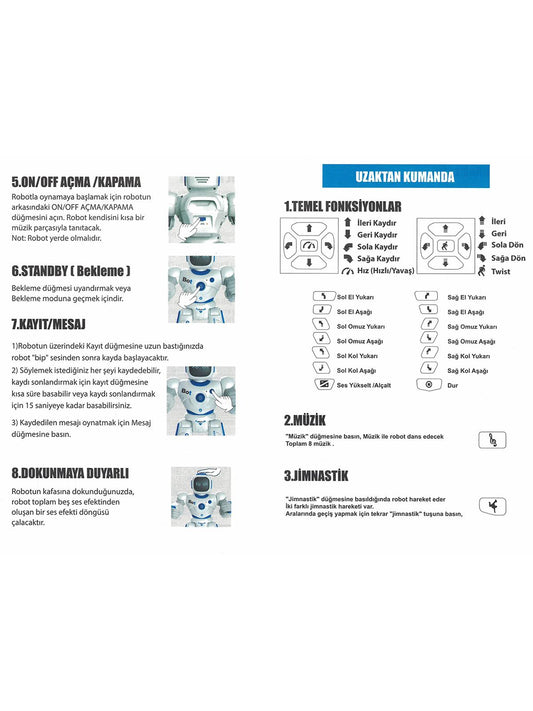 Ninni Programlama Dans Şarkı Hikaye Robot Dili Hareketli Kollar Robot 3.7V şarjlı pille çalışmaktadır. ( Piller ve usb şarj kablosu...