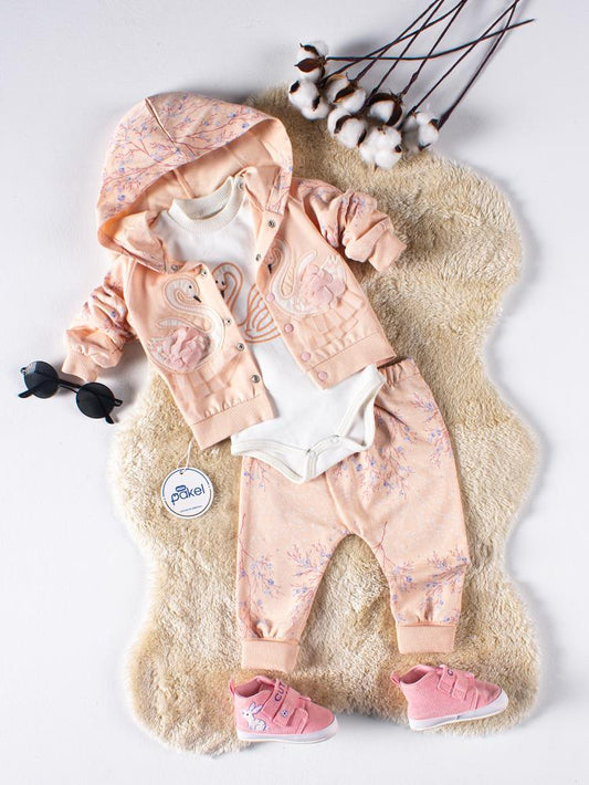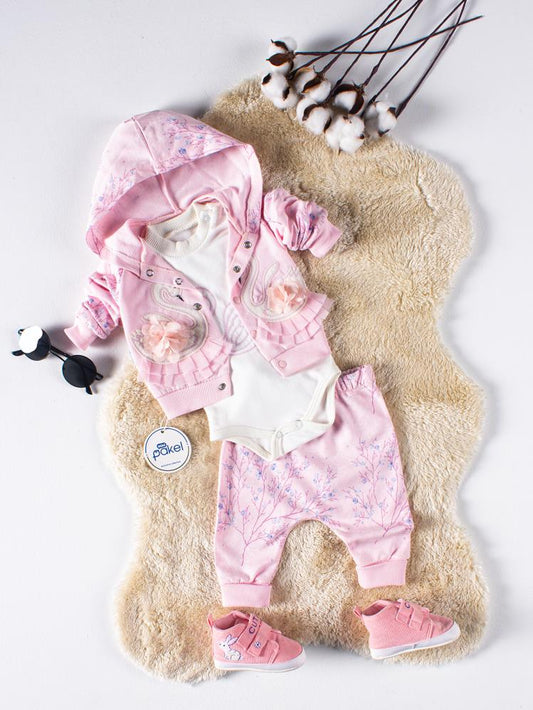 Mini pakel kapüşonlu kuğu nakışlı 3'lü 1-6 ay takım - pembe